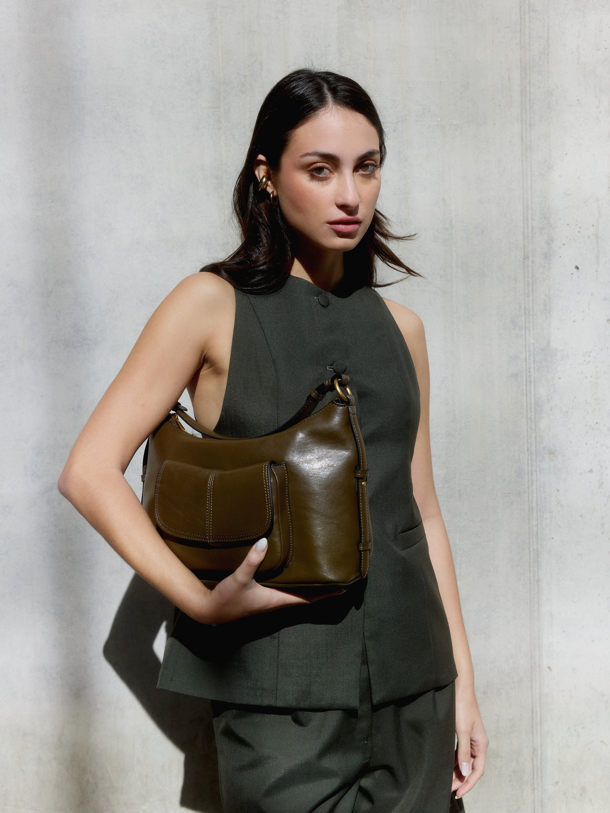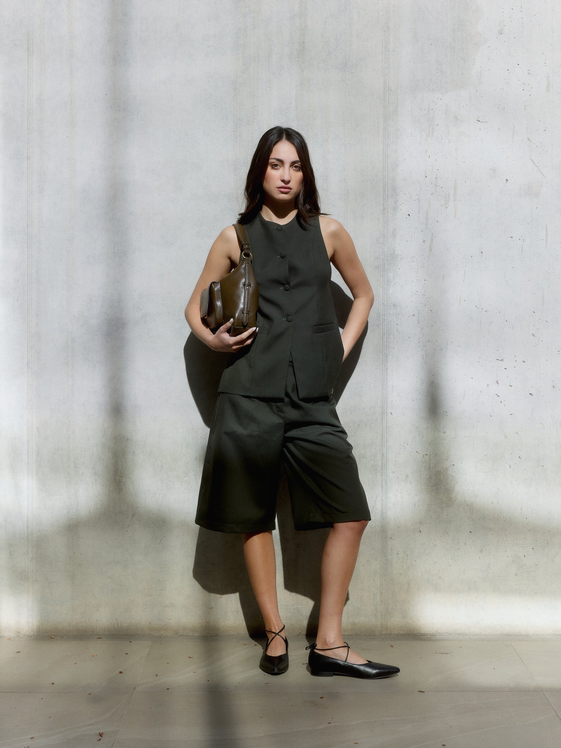 Con una silueta acampanada que aporta movimiento y sofisticación, esta chaqueta sin mangas es una pieza única que fusiona estructura y fluidez a la perfección. Su diseño limpio y femenino destaca por la caída amplia que estiliza la figura sin sacrificar comodidad.