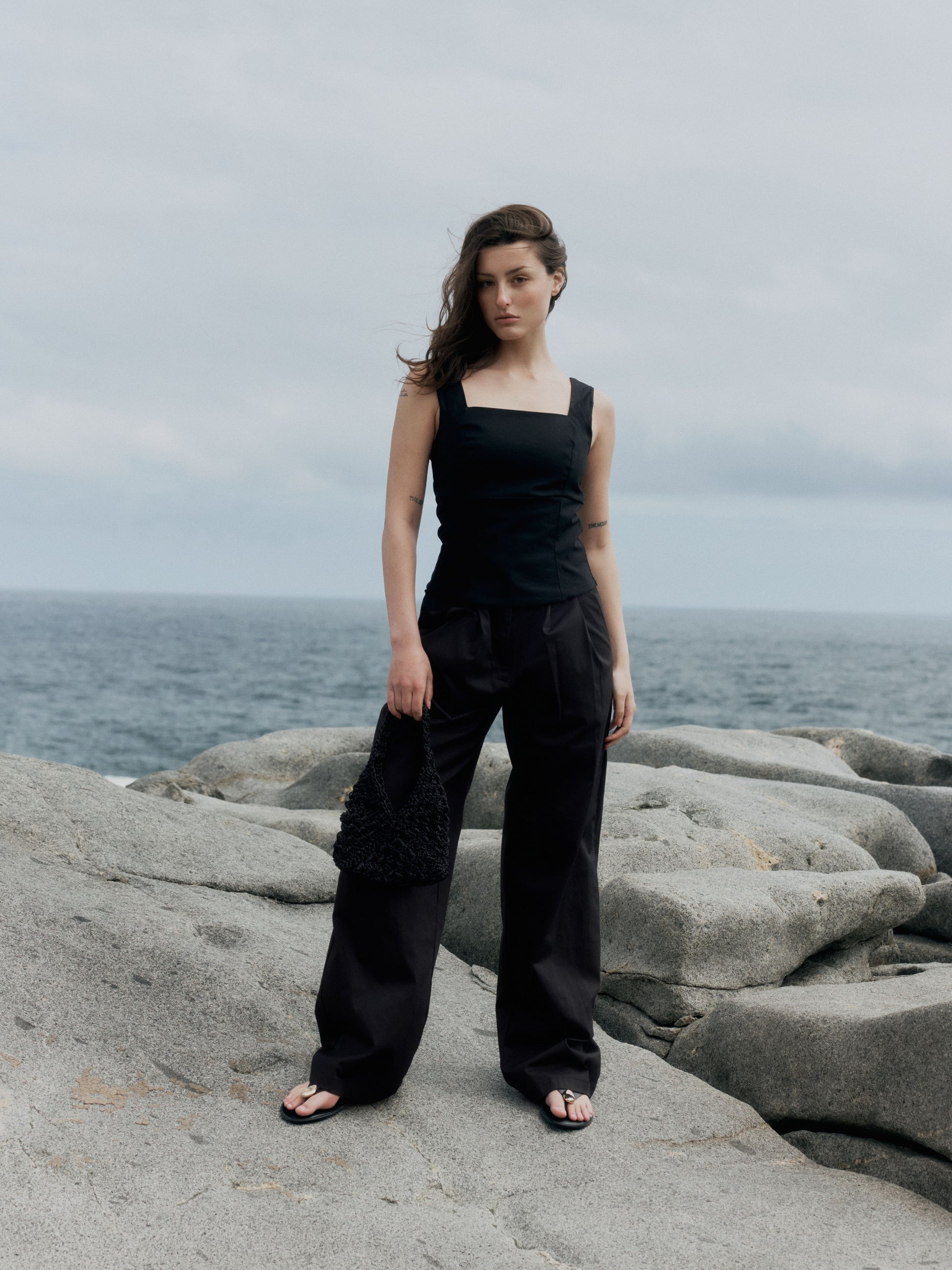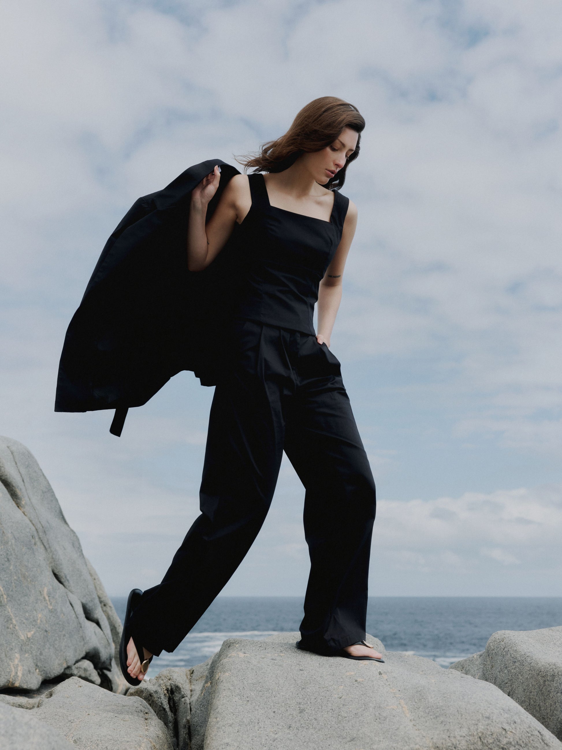 Este pantalón propone una nueva forma de elegancia funcional. Su silueta levemente englobada, con más volumen hacia los tobillos, ofrece un gesto relajado sin perder definición. La cinta ajustable en el bajo permite jugar con el calce: dejarlo suelto para una caída más fluida, o ceñido para marcar el movimiento con precisión. La textura del casimir aporta estructura y suavidad, elevando el diseño desde la materia. Este pantalón transita entre lo formal y lo casual con naturalidad, pensado para cuerpos que se mueven y espacios que cambian. Es la sastrería del trópico: ligera, versátil y con carácter.