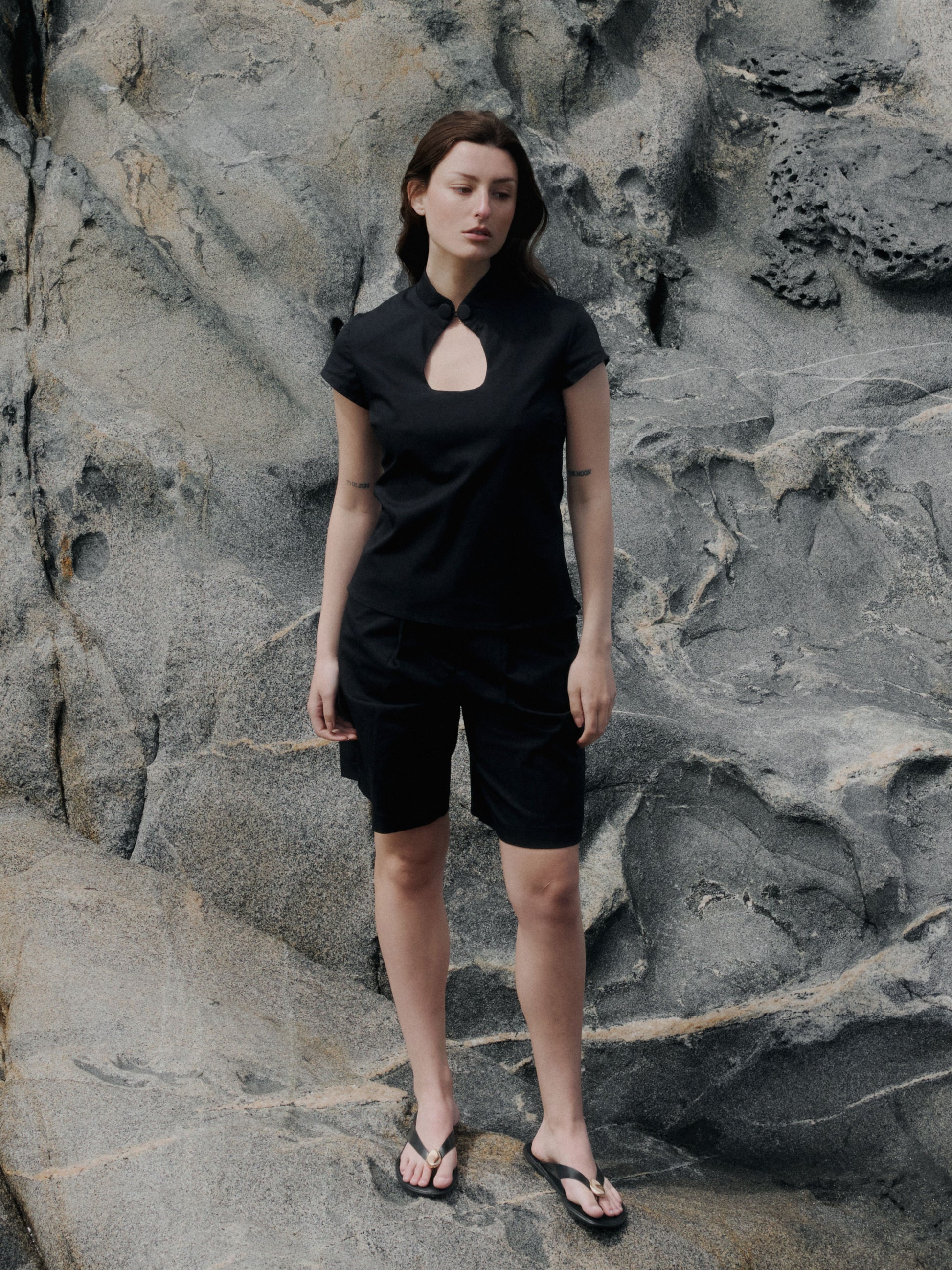 Esta prenda explora el equilibrio entre estructura y sensualidad. Su cuello tipo mao —de inspiración japonesa— aporta firmeza visual y un aire sobrio, mientras que el escote profundo al frente introduce un contraste elegante que realza la silueta con sutileza. Pensado para enmarcar el rostro y el escote sin perder sobriedad, esta prenda abraza la estética minimalista con fuerza y decisión. Su confección precisa y su calce limpio permiten que cada línea cumpla un propósito: destacar sin exagerar, seducir sin forzar. Una pieza que encuentra belleza en la contradicción: entre lo que sugiere y lo que revela, entre el cuerpo y el trazo.